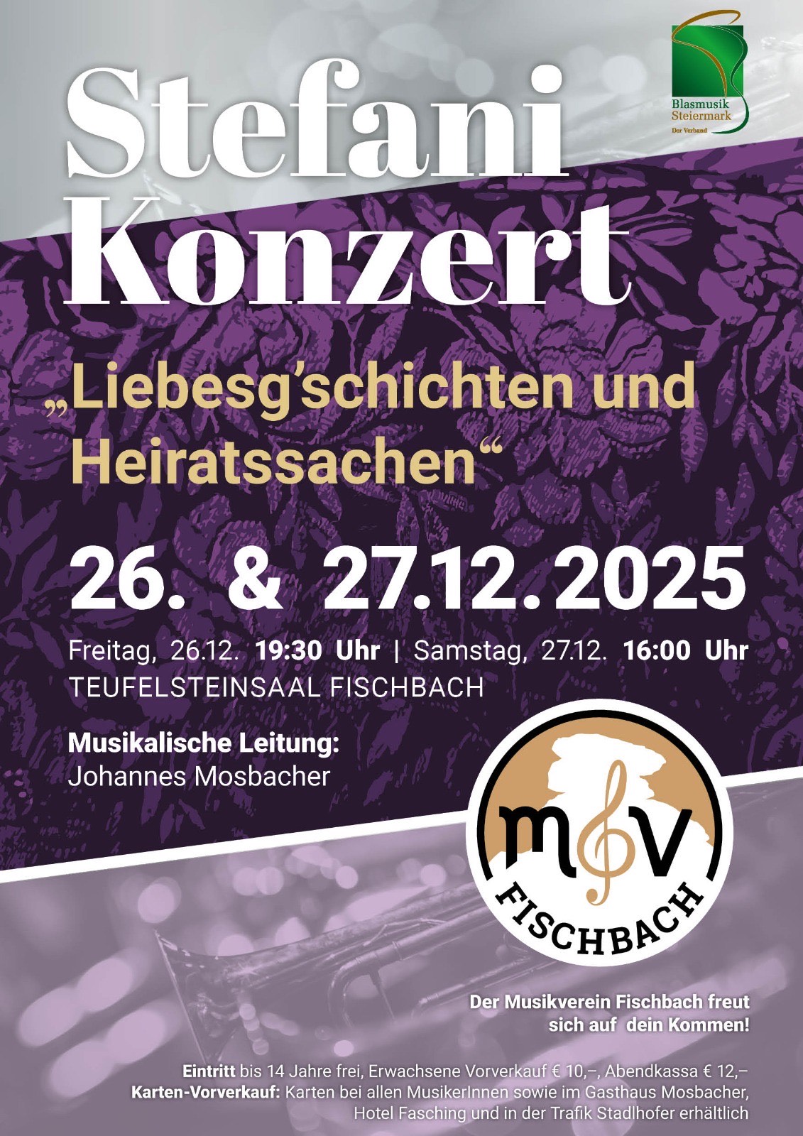 21.00 Uhr Turmblasen, 21.15 Uhr Musik und Lieder zur Weihnacht, 21.30 Uhr Christmette in der Pfarrkirche - Stefanikonzert des Musikvereins Freitag, 26. Dezember um 19.30 Uhr und am Samstag, 27. Dezember um 16.00 Uhr im Teufelsteinsaal